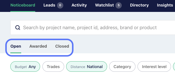 The Noticeboard is separated by project status - open, awarded and closed.