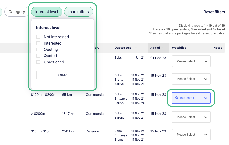 • Interest Level (either Interested, Quoting, Quoted or Not Interested as nominated when adding a project to your Watchlist)