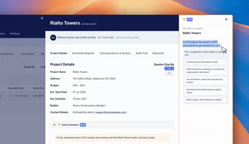 Project ChatBot helps you easily surface key project details directly from tender packs, saving you time and effort. Ask questions and get answers instantly, without scrolling through hundreds of pages of specs and drawings. Project ChatBot is an AI-powered assistant built into the Leads feature.
